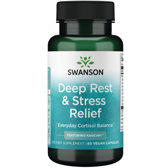 Swanson Deep Rest & Stress Relief është një qasje e butë, e bazuar në bimë, për të zgjidhur sfidën e gjumit/stresit. Ai përmban një kombinim bimor të gjumit dhe stresit të quajtur KaraCalm™ – një përzierje e bimëve të nderuara nga koha që ndihmojnë në uljen e niveleve të kortizolit, hormonit të stresit, dhe promovojnë një ritëm të shëndetshëm cirkadian. KaraCalm është i përbërë nga ekstrakte të valerianës, lules së pasionit, borzilokut të shenjtë, xinxifes, rozmarinës dhe farës së qimnonit të zi. Valeriana përdoret tradicionalisht për të nxitur gjumin, borziloku i shenjtë dhe rozmarina janë të njohura për lehtësimin e ndjenjave të stresit dhe përmirësimin e cilësisë së gjumit, lulja e pasionit dhe xinxifeja janë ndihma të besueshme për relaksim dhe fara e qimnonit të zi (Nigella sativa) ofron polifenole antioksiduese për të mbrojtur trupin nga stresi oksidativ.